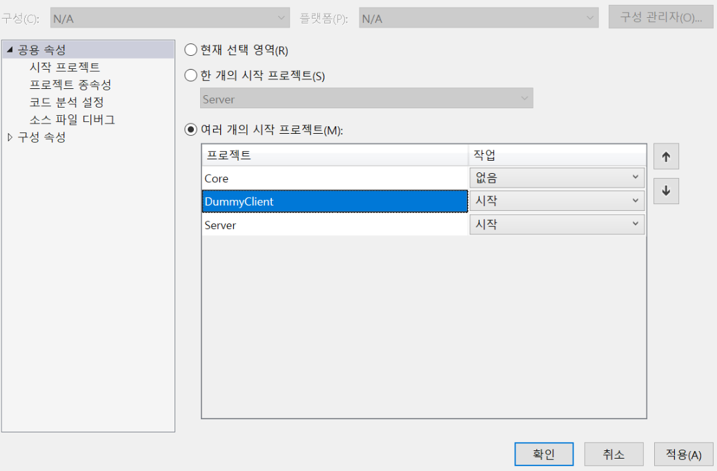 공용 속성 - 시작 프로젝트를 보면 기본적으로, 한 개의 시작 프로젝트에 선택이 되어있다.