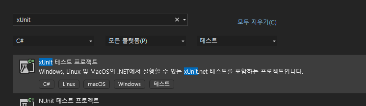 새 프로젝트 추가에서 xUnit을 검색하고, 그것으로 프로젝트를 만들면 됩니다.